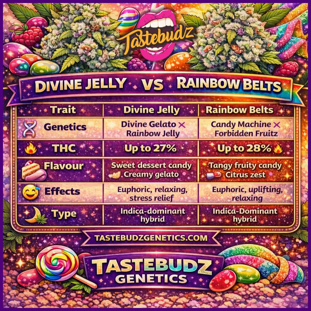 Divine Jelly vs Rainbow Belts cannabis strain comparison infographic showing genetics, THC levels, flavour profiles and effects from Tastebudz Genetics
