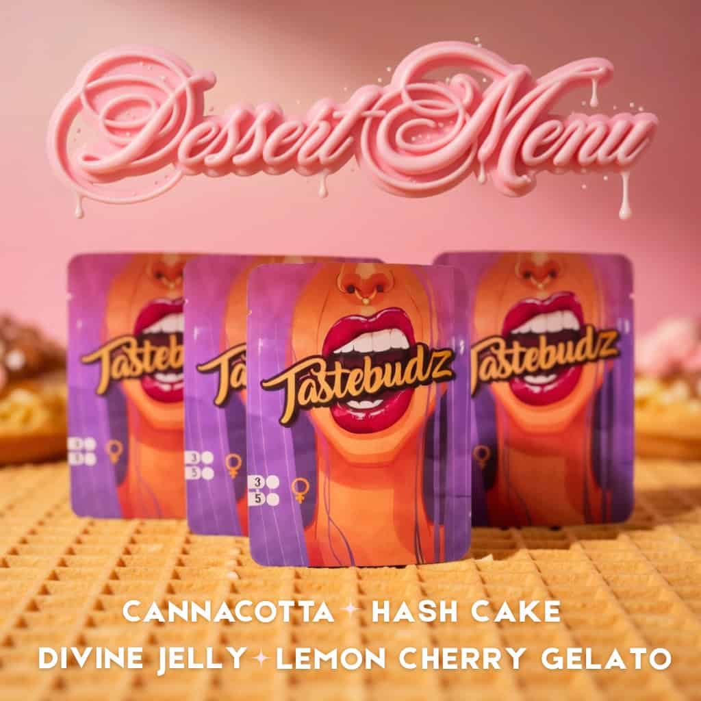 Tastebudz Genetics Dessert cannabis seed mix featuring Hash Cake, Divine Jelly, Lemon Cherry Gelato and Cannacotta feminized seeds, featuring dessert style background