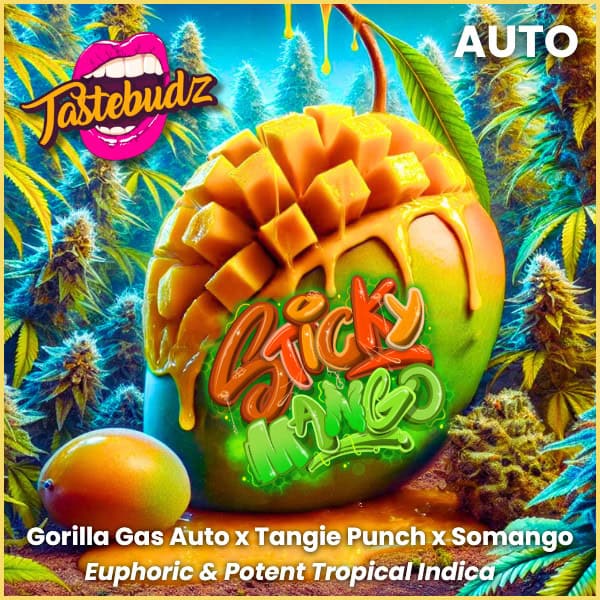 Tastebudz Sticky Mango Strain Autoflowering Seeds combine the bold flavour of tropical mango with a powerful 30% THC punch. Created from Gorilla Gas Auto x Tangie Punch x Somango, this exotic indica-dominant hybrid is built for those who want fruity fire, fast.